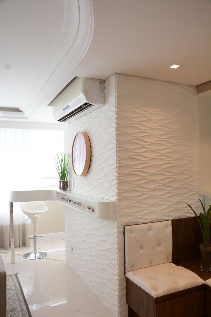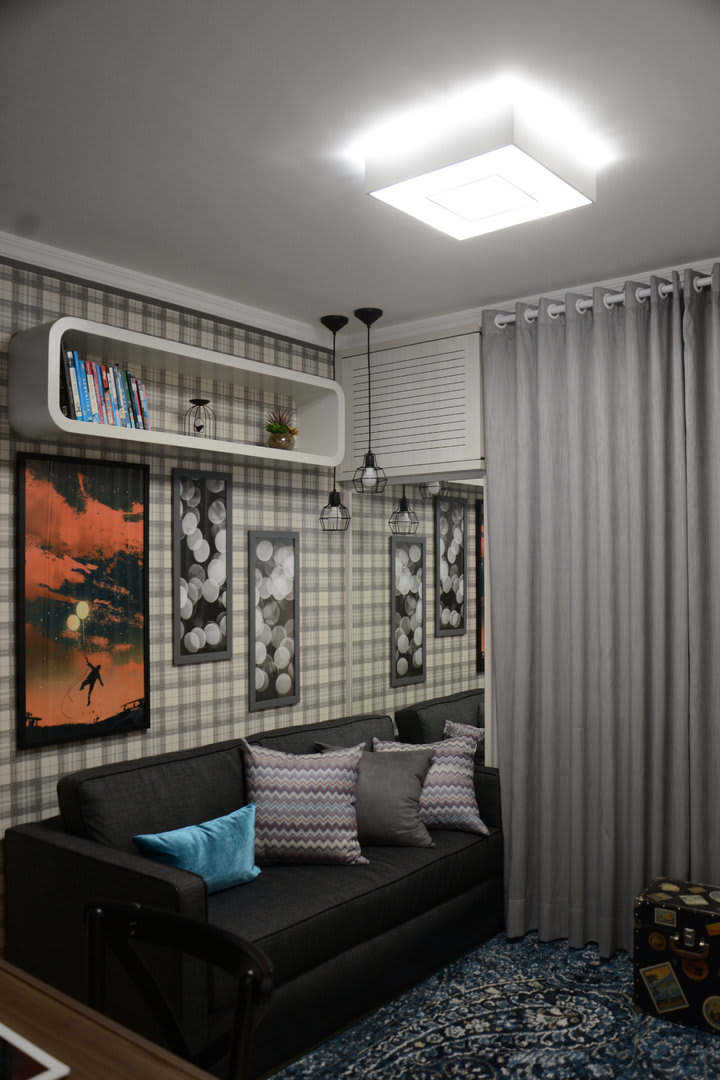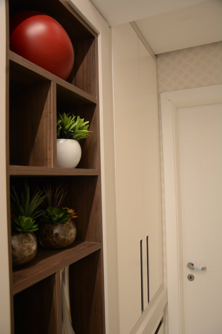 o dormitório do casal cores neutras garantem um descanso sem ser cansativo. Na sala, tons fendi, amadeirado e muita laca preta e branca contrastam com os detalhes em vermelho. No quarto de hóspedes e escritório, muita ousadia nos tons e mobiliário diferenciado.