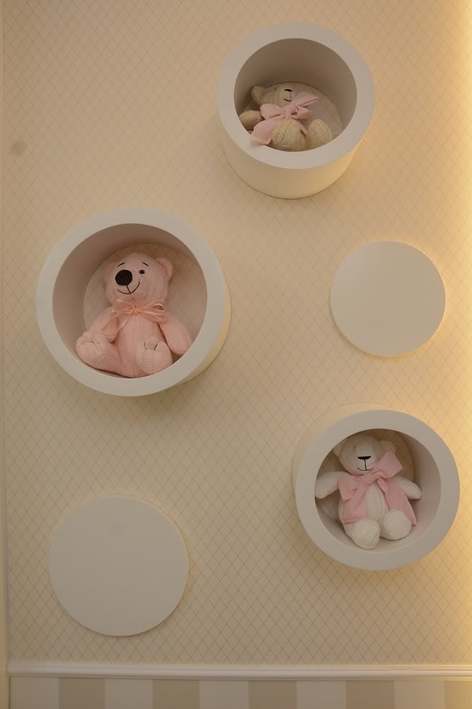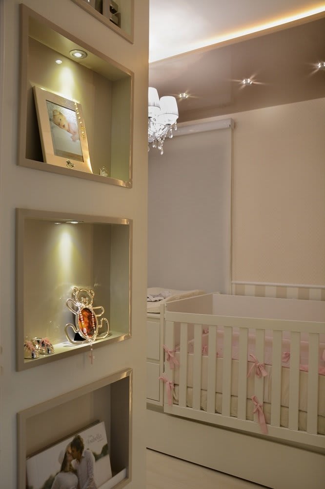 Projeto de Dormitório de bebê, menina, onde a solicitação da cliente é que trabalhássemos tons leves e neutros, mas não deixando de lado o estilo clássico e lúdico de uma menina princesa. Utilizamos muitos tons neutros, nudes, com papel de parede, cristais e iluminação para criarmos efeitos incríveis.